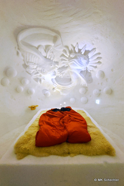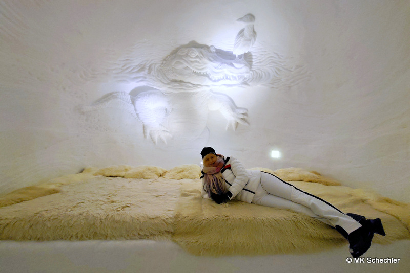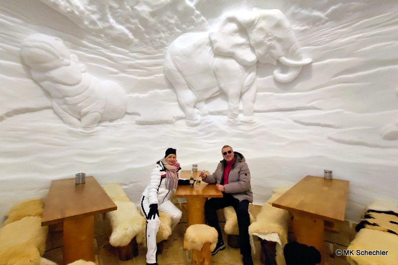 Der offizielle Treffpunkt für alle Gäste ist um 16:30 Uhr im Restaurant Sonnalpin auf dem Zugspitzplatt. Dort wurden wir herzlich von einem der Guides begrüßt und erhielten erste allgemeine Informationen zum Ablauf des Abends und Tipps zur Übernachtung. Ski und Snowboards bleiben vor dem Restaurant zurück – ab hier beginnt das Abenteuer abseits der Pisten. Was sofort auffiel: die Guides. Alle waren außerordentlich hilfsbereit, ruhig und sehr professionell. Fragen wurden geduldig beantwortet, Abläufe verständlich erklärt. Besonders spannend waren die Einblicke in die Geschichte des Iglu-Dorfes und des aufwendigen Bauprozesses. Jedes Iglu, jede Wand und jede Kuppel entsteht aus Schnee und Eis – präzise geplant und dennoch jedes Jahr ein Unikat, dieses Jahr zum Thema „Wasserwelten“. Dabei wird vor Allem der Altschnee des Vorjahres verwendet, der vor Ort jedes Frühjahr nach Ende der Skisaison zusammengeschoben und mit einer Plane abgedeckt über den Sommer gerettet wird. Vorteil Altschnee gegenüber Neuschnee beim Iglubau: Während Altschnee beim zusammenpressen nur 5% Volumen verliert Neuschnee zwei Drittel. Der Aufbau mit Altschnee vereinfacht damit den Aufbau ungemein.
